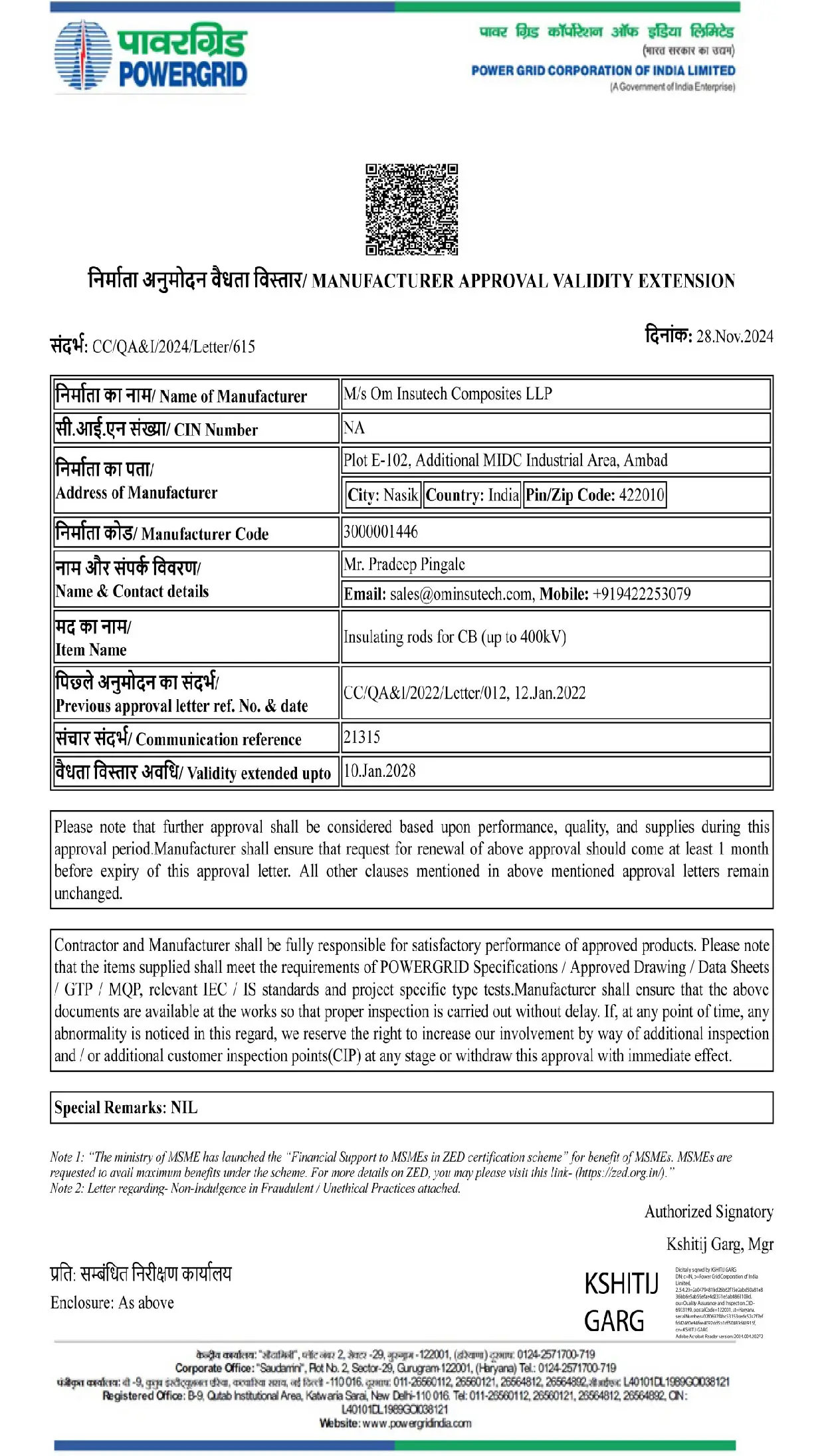 Approval Letter for Supplying Insulating Rods for CB UPTO 400 KV